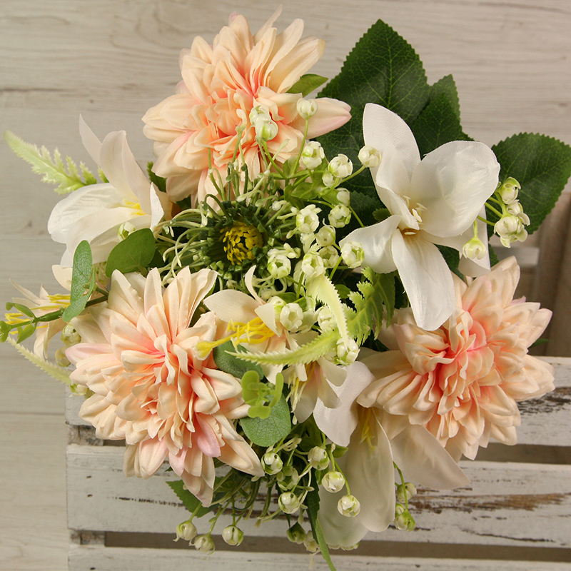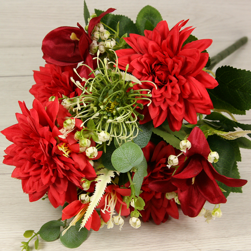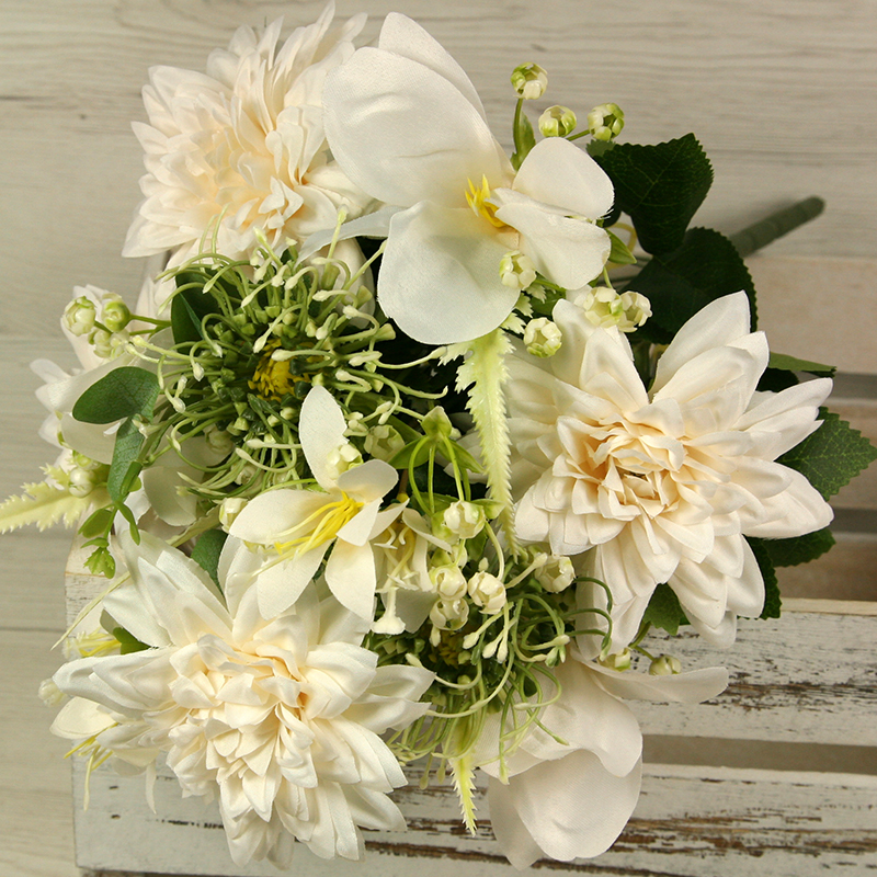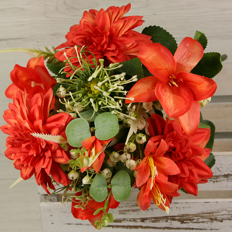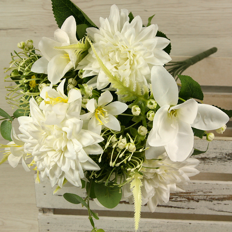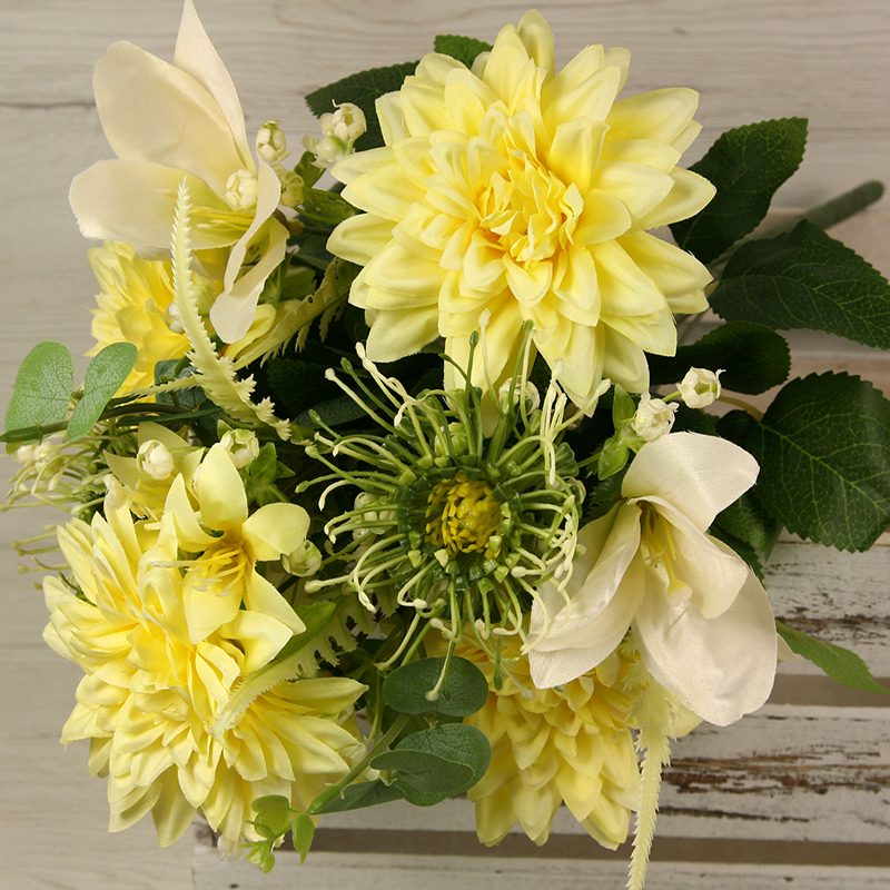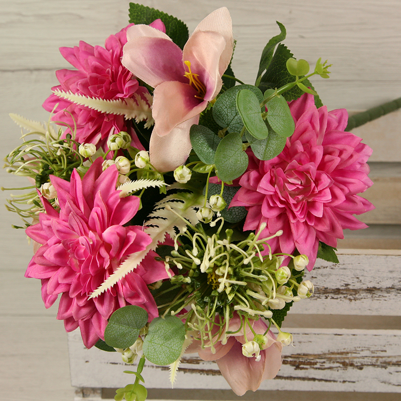 Získajte dotyk prírody bez starostí o udržiavanie s našou kyticou dália, ľalia s doplnkami x11. Táto nádherná kytica prináša do vášho interiéru krásu a živosť kvetín, bez toho aby ste museli dbať na zalievanie alebo slnečné svetlo. S dĺžkou 45 cm a pestrou paletou farieb, kytica dália, ľalia s doplnkami x11 je ideálna na ozdobenie vášho domova, kancelárie alebo podujatia. Táto kytica z dálií a ľalií s doplnkami x11 sa môže tiež použiť do rôznych svadobných aranžmánov, smútočných vencov, nábytkových aranžmánov alebo iných dekoratívnych projektov.